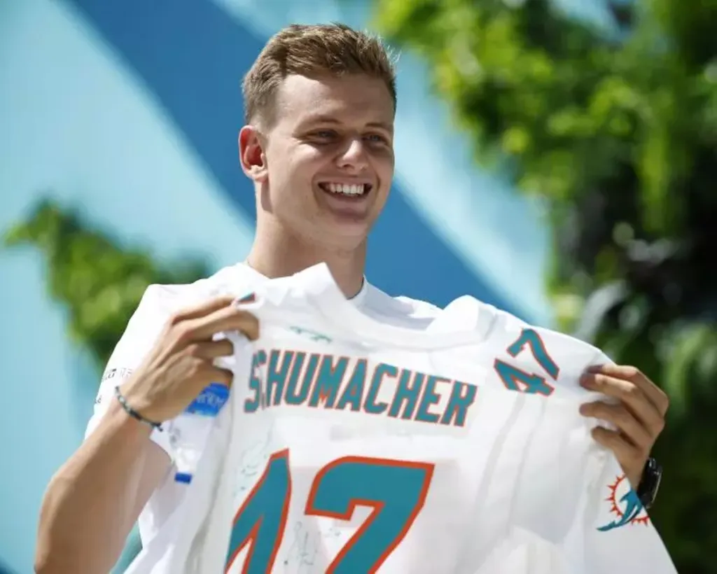 | Mick Schumacher se voit offrir un maillot de l'équipe de NFL des Miami Dolphins, le 5 mai 2022 en marge du Grand Prix de Formule 1 de Miami. |