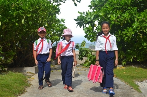 | Des élèves sur l'île de Sinh Tôn, archipel de Truong Sa, sur le chemin de l'école. |