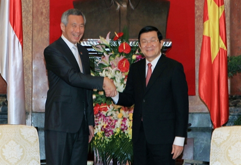 | Le président du Vietnam (droite) et le Premier ministre singapourien Lee Hsien Loong lors de sa visite au Vietnam |