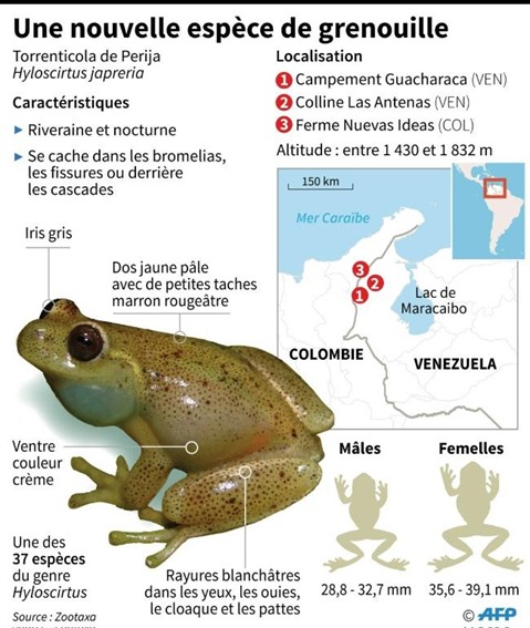 Peau multicolore et chant particulier, l'Hyloscirtus japreria, qui vit dans les rivières et les cours d'eau au-dessus des 1.000 mètres d'altitude, a été découverte lors d'expéditions qui ont commencé il y a une dizaine d'années.
