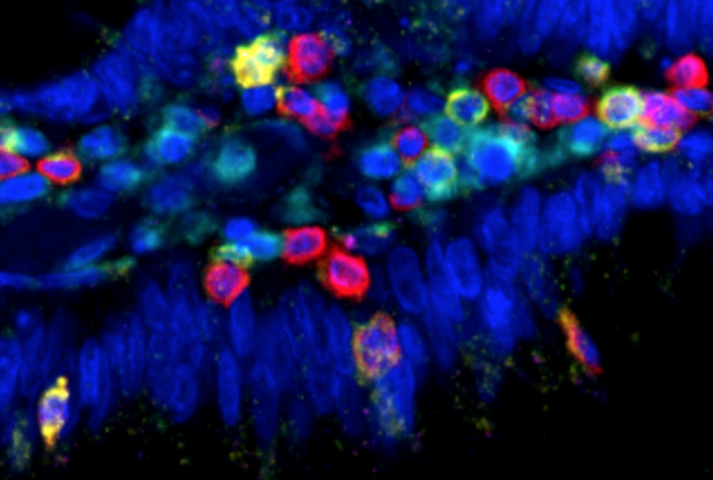 | Visualisation en coloration multispectrale d’une sous-population de cellules immunitaires infiltrant une tumeur. |