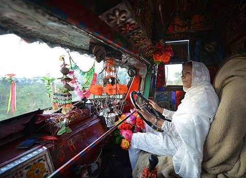 | Une Pakistanaise conduisant un camion. |