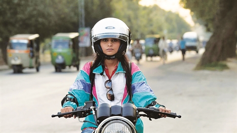 | L’étudiante pakistanaise Tayyaba Tariq à moto dans une rue de Lahore. |