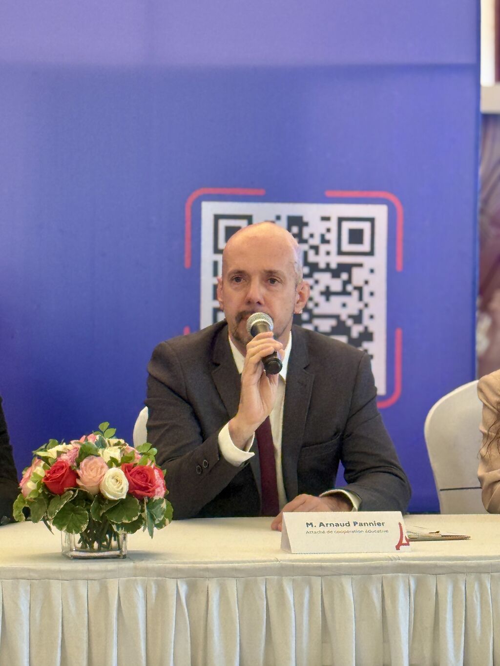 | Eric Soulier (au micro), conseiller de coopération et d’action culturelle à l’ambassade de France au Vietnam, insiste sur la nécessité d’un tel écosystème pour guider les familles dans l’apprentissage du français de leurs enfants. |