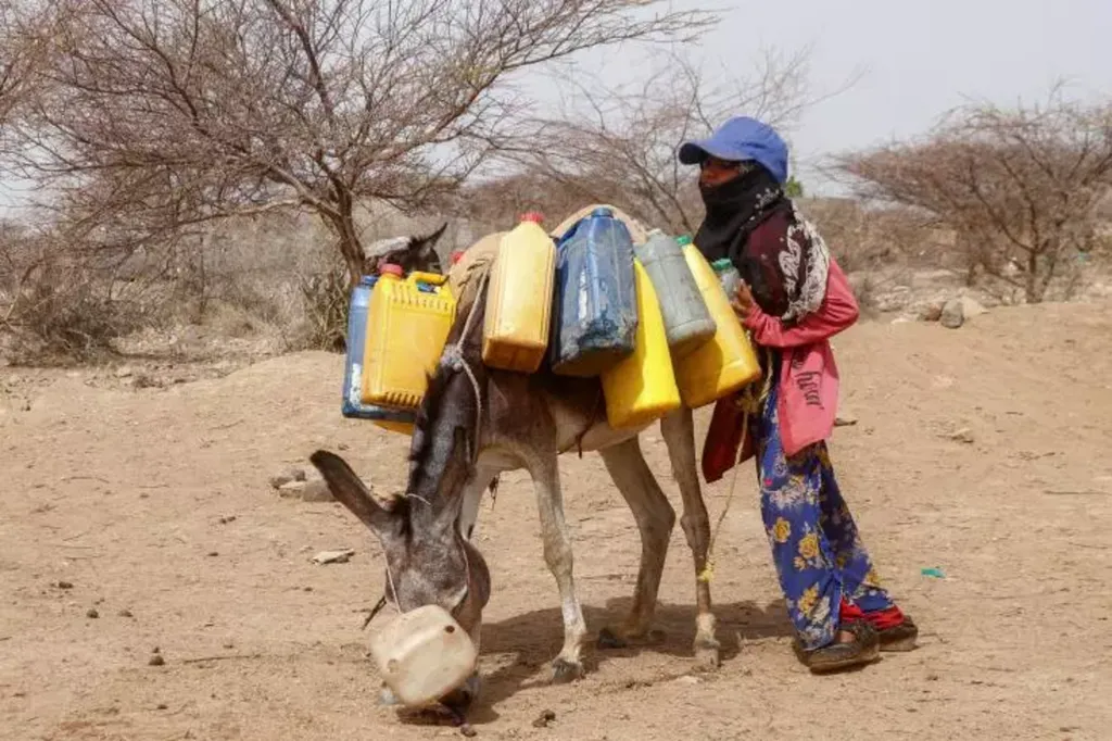 | Une enfant transporte à dos d'âne des jerrycans remplis d'eau d'un puits dans un camp pour personnes déplacées, au sud de Hodeida, le 19 juillet au Yémen. |