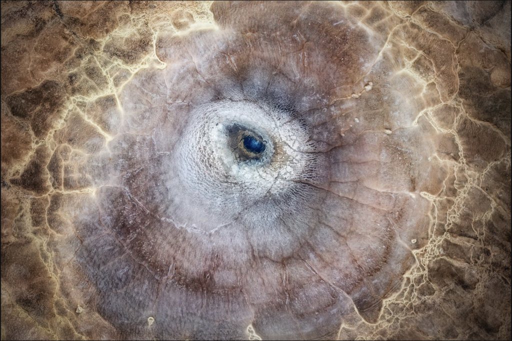 | Un lac géothermique en forme d'œil de dragon, avec un centre bleu profond évoquant une "pupille". |