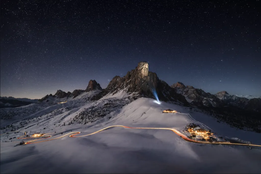 | L’auteur a marché jusqu’au point de vue lors d’une nuit d’hiver glaciale à -14°C, attendant qu’une voiture traverse le col et marchant à travers une épaisse couche de neige pour s’approcher suffisamment afin de capturer la lumière éclairant la montagne. |
