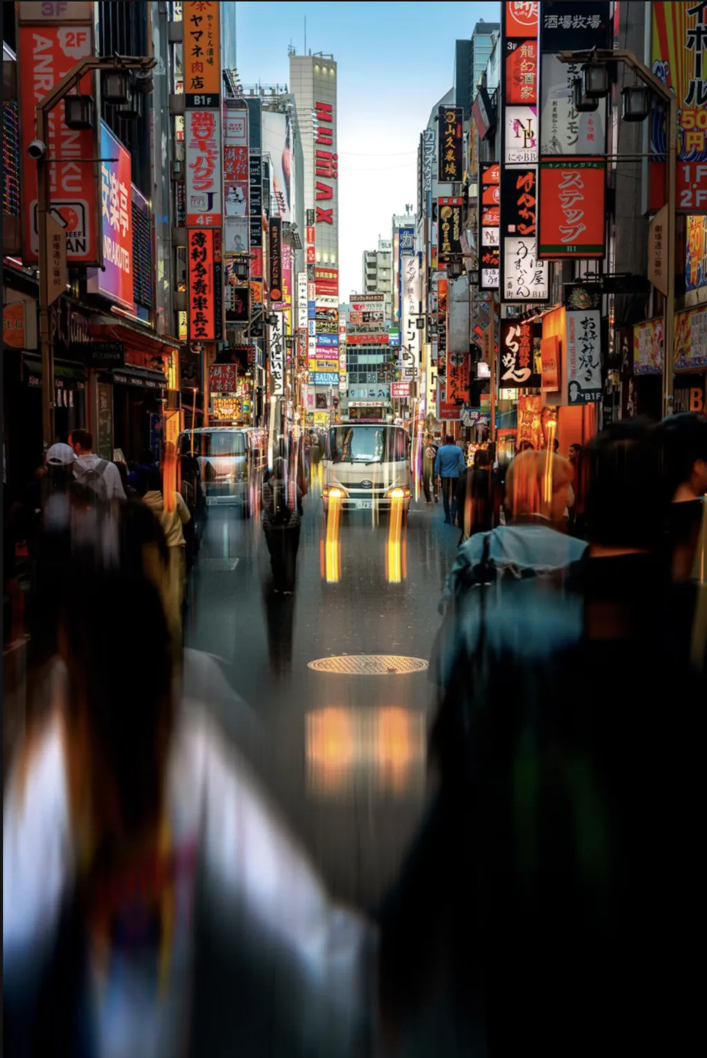 | Il y a de nombreux sujets dans cette scène décrivant le bruit, la beauté et la complexité de la vie urbaine à Tokyo. |