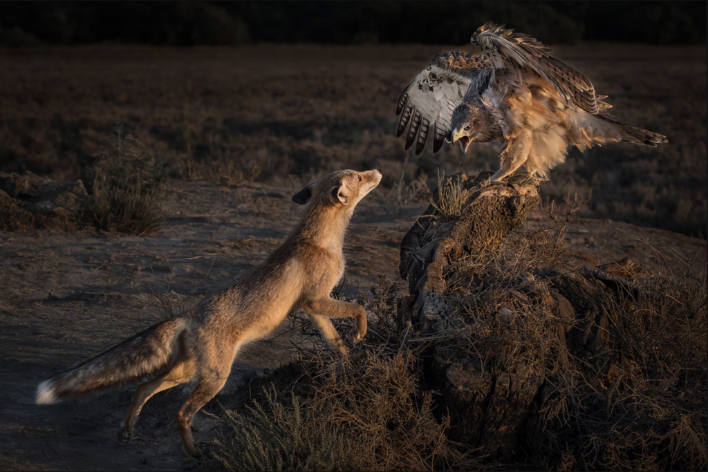 | "Le renard s’est approché de l’aigle de plus en plus près, jusqu’à ce que son museau frôle presque le bec de l’oiseau. J’ai pris des photos frénétiquement, tout en priant pour avoir correctement réglé tous les paramètres de l’appareil", a déclaré la photographe Victoria Andrews à propos de la prise de cette photo. |