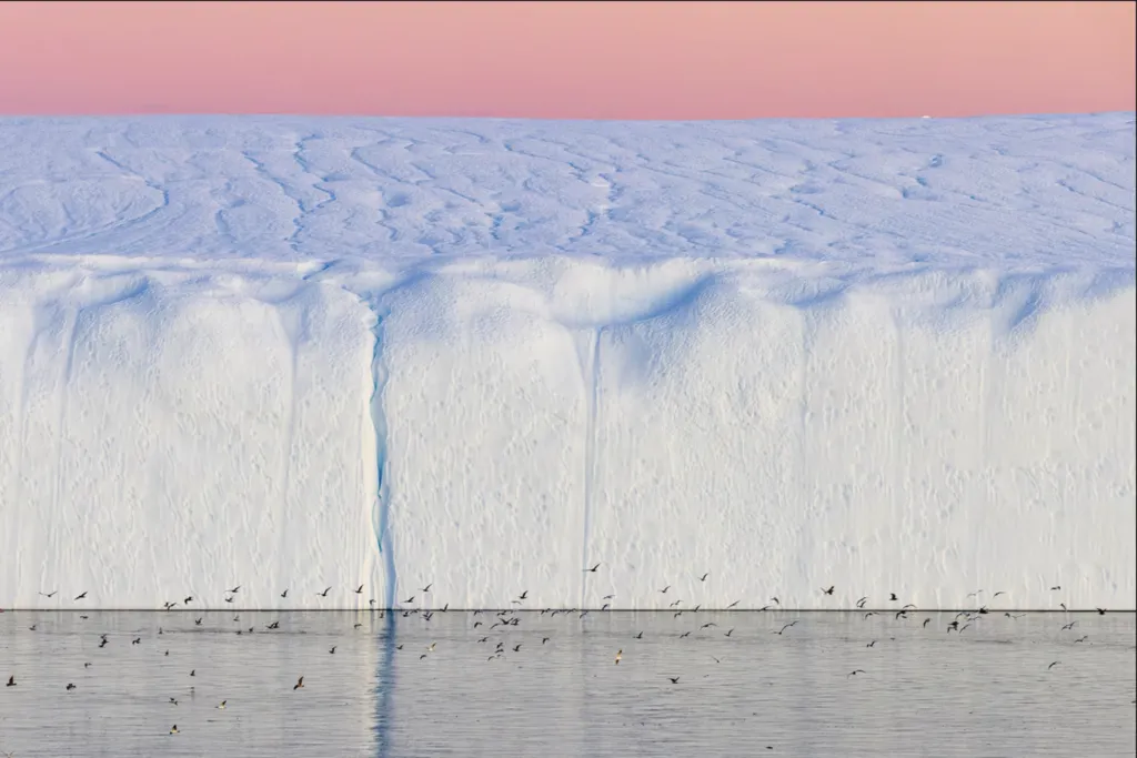 | Le bruit de la glace qui se fissure a fait s’envoler les oiseaux qui se reposaient. |