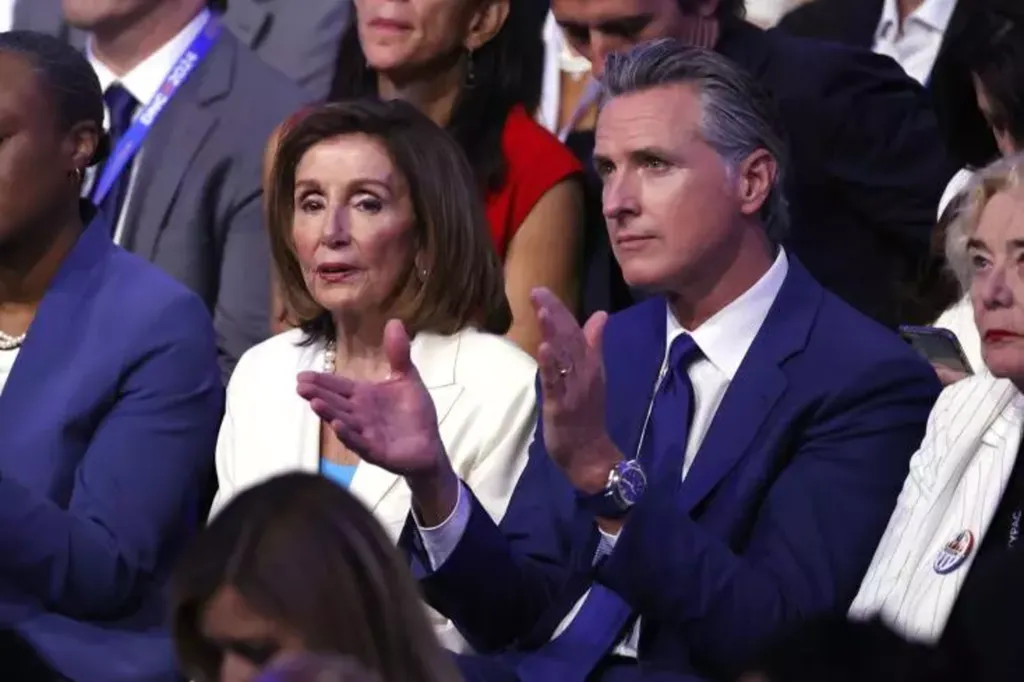 | Nancy Pelosi, ancienne présidente de la Chambre des représentants des États-Unis, et le gouverneur de Californie, Gavin Newsom, lors de la convention nationale démocrate à Chicago, le 22 août dans l'Illinois. |