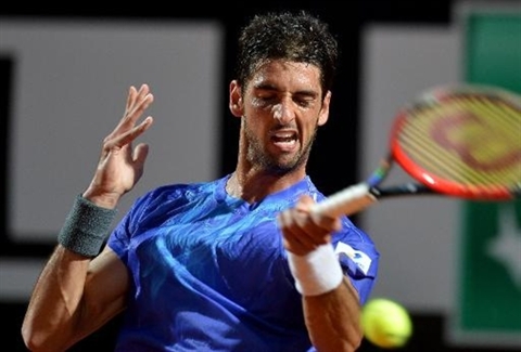 | Le Brésilien Thomaz Bellucci face à Novak Djokovic, lors du Masters 1000 de Rome, le 14 mai |