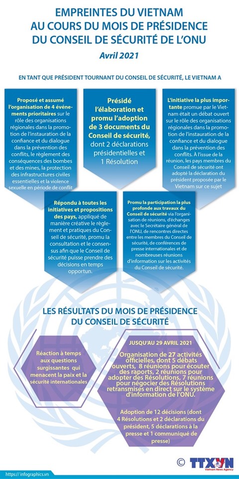 À cette occasion, les membres du Conseil de sécurité de l’ONU ont approuvé la première Déclaration de la présidence vietnamienne sur le règlement des conséquences des bombes et mines. Le débat ouvert au niveau ministériel du Conseil de sécurité de l’ONU sur la protection des infrastructures essentielles à la vie des habitants, mené sous forme virtuelle et directe le 27 avril.