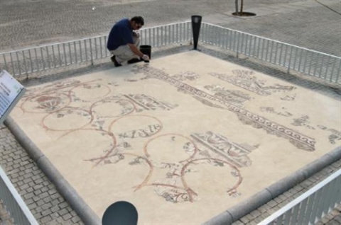 | Un employé de l'Autorité israélienne des antiquités travaille sur une mosaïque de la période byzantine, le 29 septembre à Kiryat Gat. |