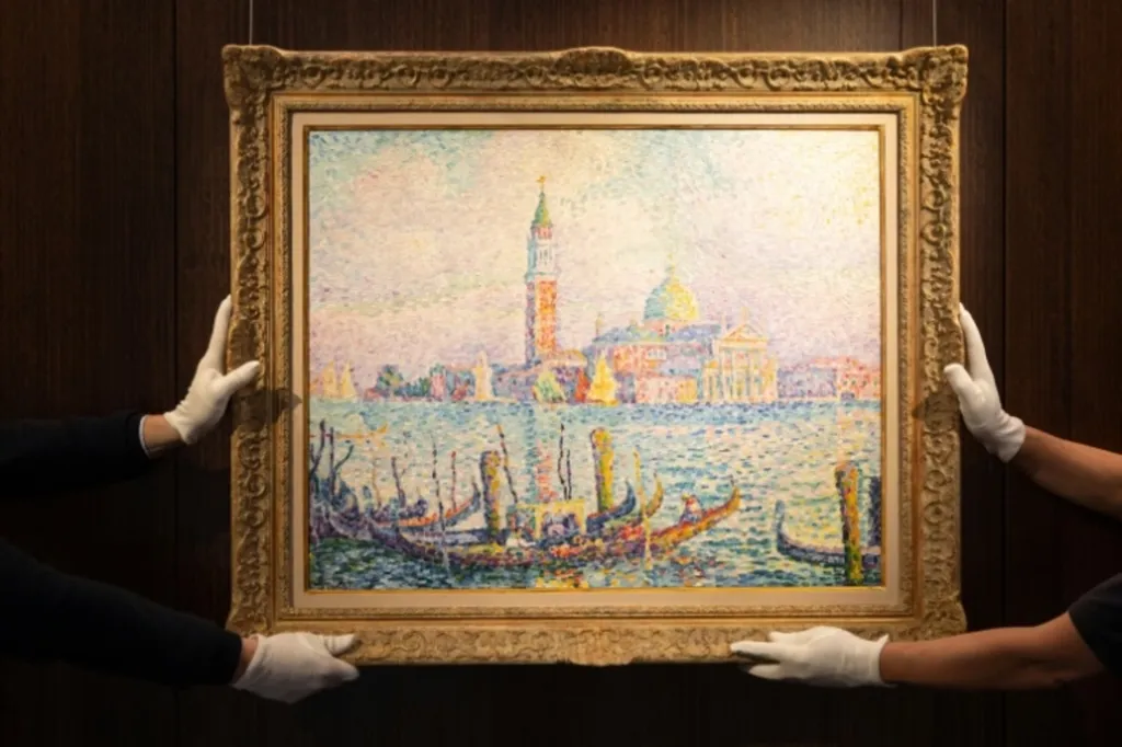 | Des employés de Sotheby's présentent le tableau "Saint-Georges. Couchant (Venise)" du peintre français Paul Signac à Paris, le 9 avril 2025 avant une vente aux enchères à New York en mai. |