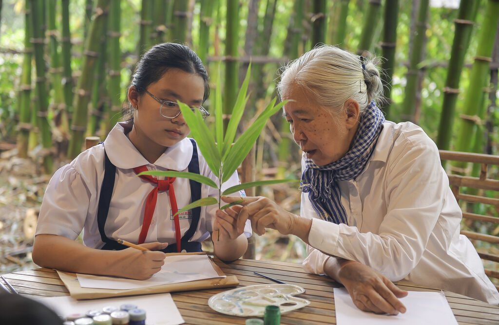 | La scientifique Diêp Thi My Hanh initie une jeune fille aux diff é rents usages du bambou dans le village de Phu An. |