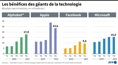 Qu'ils capitalisent sur le temps passé en ligne par les internautes, sur leurs transactions ou leurs achats d'appareils électroniques, les géants de la tech ont réalisé des profits exubérants début 2021, tandis que l'économie traditionnelle souffrait des restrictions de déplacement et d'activités liées à la pandémie.
