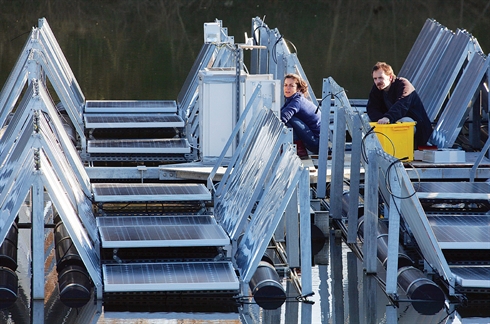 | Des ingénieurs vérifient un système de panneaux photovoltaïques flottants. |