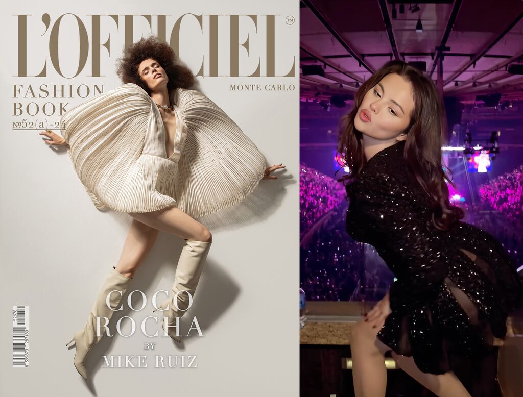 | Selena Gomez (droite), charmante dans une création signée Công Tri et Coco Rocha, éblouissante sur la couverture de "L'Officiel Fashion Book Monte Carlo". |