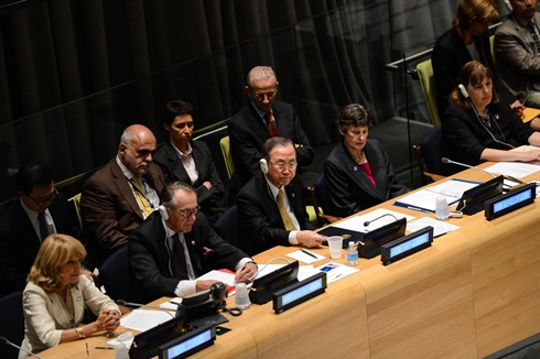 | Le secrétaire général des Nations unies Ban Ki-moon (1er plan, centre) lors de la cérémonie de signature du Traité sur le commerce des armes, le 3 juin aux États-Unis. |