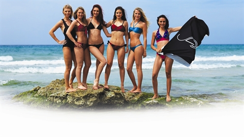 | Sur le bikini, un produit haut de gamme vendu 149 euros et fabriqué sur mesure, est attaché un petit capteur noir étanche qui mesure le rayonnement des ultraviolets. |