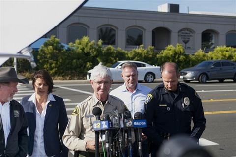 | Le shérif du comté de San Diego, Bill Gore, lors d'une conférence de presse à Poway (Californie) après une fusillade dans une synagogue le 27 avril 2019. |