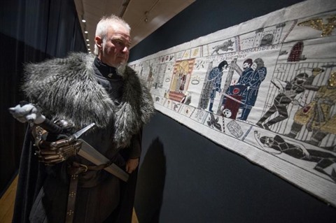 | Un personnage de "Game of Thrones" pose devant la tapisserie réalisée à Bayeux à partir de la série. |