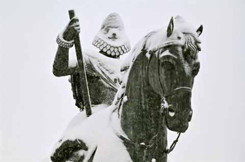 | La statue de Philippe III couverte de neige sur la Plaza Mayor à Madrid le 9 janvier 2. |