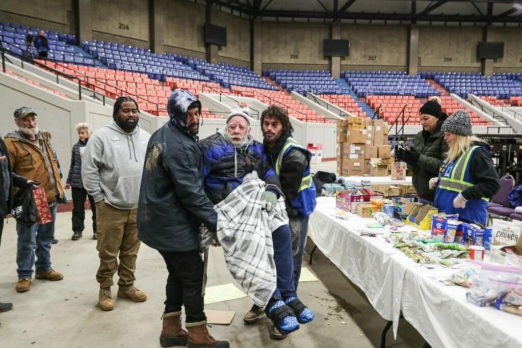 | Des bénévoles aident une personne sans-abri à Louisville, dans le Kentucky, dans un refuge ouvert pour faire face à une tempête hivernale, le 23 décembre. |