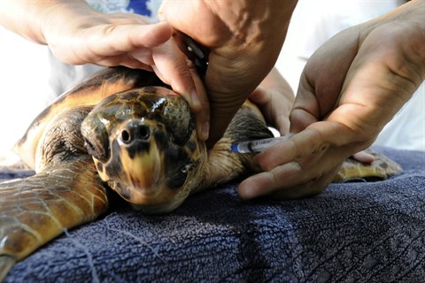 | Un vétérinaire soigne une tortue caouanne au centre de "Lampedusa Turtle Rescue", sur l'île italienne de Lampedusa le 12 octobre 2015. |