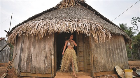 | Une femme de la tribu des Uru-eu-wau-wau dans leur réserve au sud de Porto Velho, le 29 août 2019 au Brésil. |