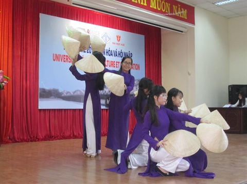 | La cérémonie d’ouverture de l’Université d’été des étudiants francophones a débuté par une danse, présentée par des élèves du Département de français de l’École supérieure de langues étrangères de Huê (Centre). |
