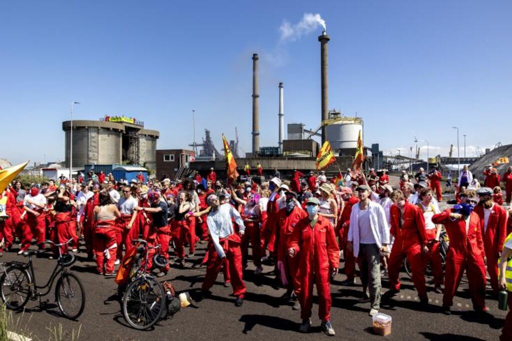| Manifestation écologiste sur le terrain d'une usine Tata Steel à Velsen, aux Pays-Bas, le 24 juin. |