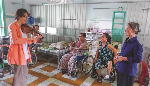 | Sabine Mignot joue du violon pour encourager les gens. |