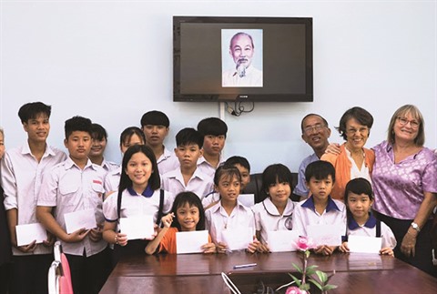 | Sabine Mignot (2e à droite) offre des bourses scolaires à des enfants orphelins. |