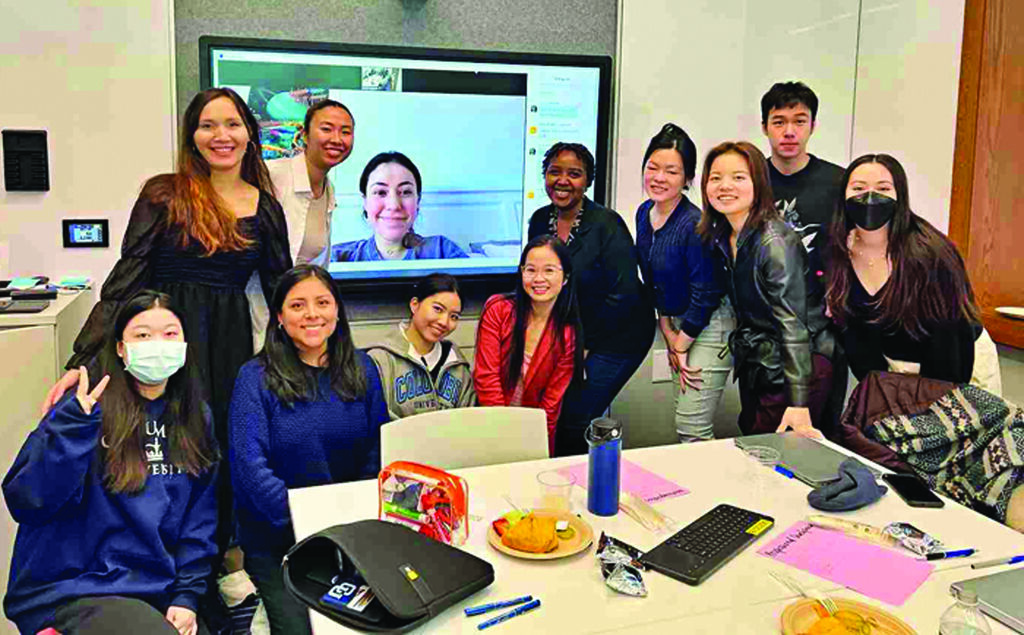 | Mme Hoa (chemise rouge) entourée d’étudiants de l’École de pédagogie de l’Université de Columbia. |