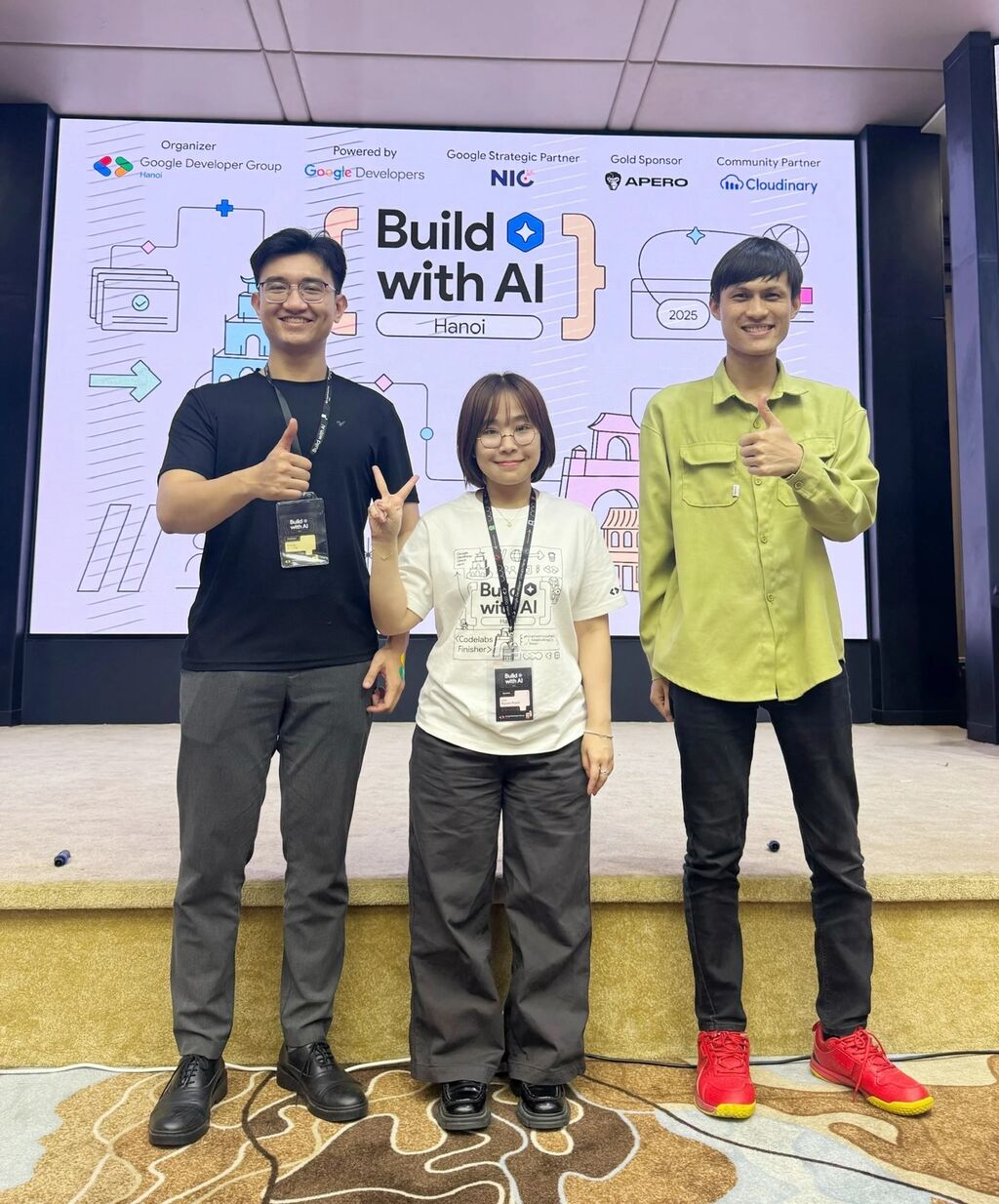 | Khanh Linh (centre) pose avec des étudiants lors de l’événement Build With AI de Google, le 14 avril à Hanoï. Photo : CTV/CVN |