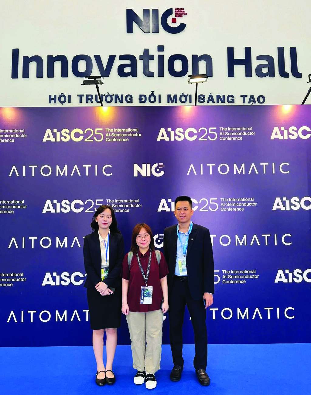 | Khanh Linh (centre) lors de la conférence internationale AISC 2025 sur l’IA et les semi-conducteurs tenue en mars dernier à Hanoï. Photo : DV/CVN |