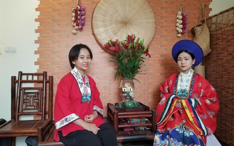 | Trân Thi Trang (gauche) porte une robe "nhât binh" modifiée et est assise à côté d'une jeune femme portant la robe traditionnelle "nhât binh". |