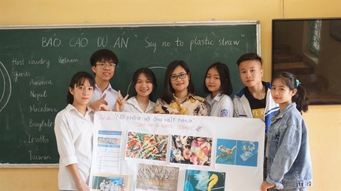 | Hà Anh Phuong (centre) et ses élèves dans une heure de classe, à Phu Tho (Nord). |