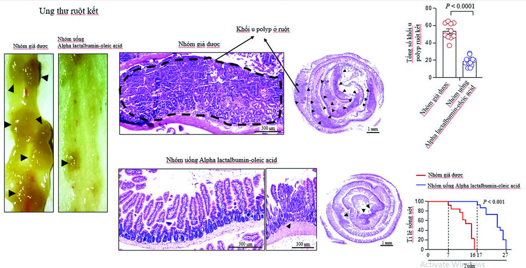 | Images du cancer colorectal et effet du complexe alpha lactalbumine-acide oléique sur la réduction des polypes tumoraux (les tumeurs sont indiquées par des flèches noires). |