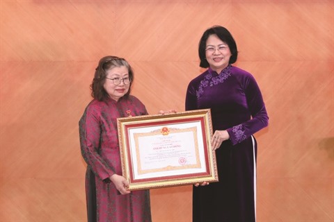 | La vice-présidente de la République, Dang Thi Ngoc Thinh (droite), remet le titre de "Héros du Travail dans la période de Renouveau" à la virologiste Huynh Thi Phuong Liên. |