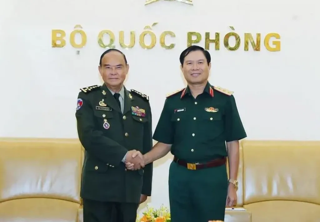| Le chef d’état-major général de l’Armée populaire du Vietnam et vice-ministre de la Défense, Nguyên Tân Cuong (droite), et le commandant en chef adjoint des Forces armées royales cambodgiennes et commandant de l’Armée royale cambodgienne, Mao Sophan, le 6 juin. |