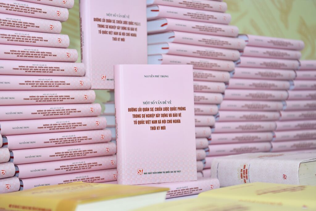 | Le livre "Certaines questions sur la politique militaire, la stratégie de défense dans l’œuvre d’édification et de défense de la Patrie du Vietnam socialiste dans la nouvelle période" du secrétaire général du PCV, Nguyên Phu Trong. |