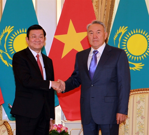 | Le président vietnamien Truong Tân Sang et son homologue kazakh Nursultan Nazarbayev, le 10 septembre au Kazakhstan |
