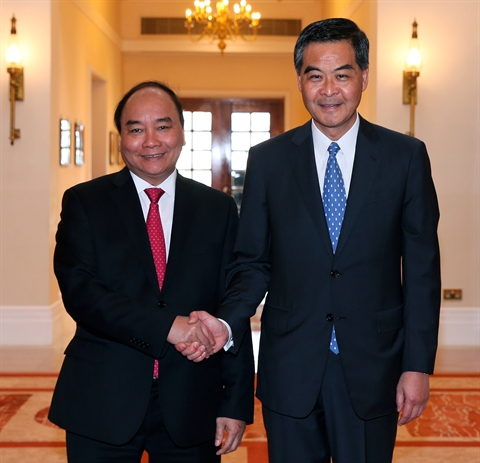 | Le Premier ministre Nguyên Xuân Phuc (gauche) et le chef de l'exécutif de Hong Kong, Leung Chun-ying, le 15 septembre à Hong Kong (Chine). |