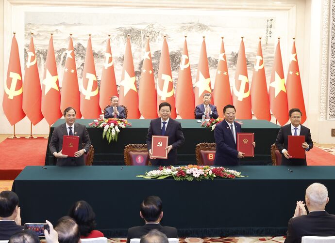 | Le secrétaire général du Parti communiste du Vietnam et président du Vietnam, Tô Lâm (à gauche) et le secrétaire général du Comité central du Parti communiste chinois et président de la République populaire de Chine, Xi Jinping lors de la cérémonie de signature des accords de coopération entre les deux pays. |