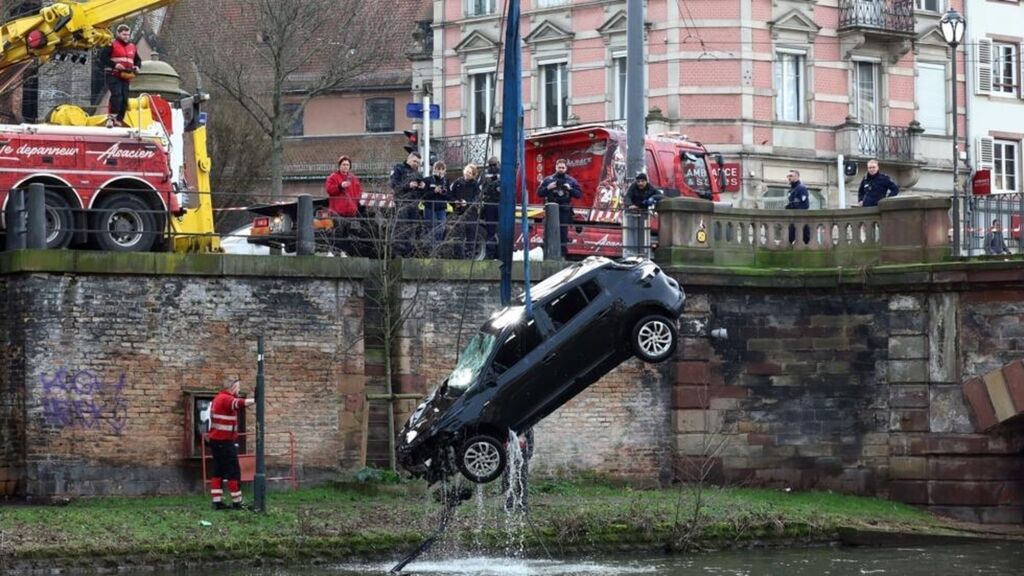 | Une grue sort une voiture tombée dans l'Ill après un accident dans lequel deux personnes ont été tuées, le 15 février à Strasbourg, dans le Bas-Rhin. |