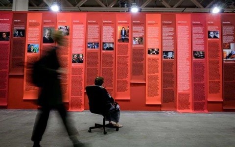 | Des visiteurs devant l'œuvre d'Andrea Bowers "Open Secret", à la foire internationale de l'art contemporain Art Basel à Bâle, en Suisse, le 12 juin. |