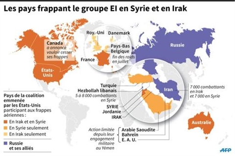 | Carte localisant les pays frappant l'EI en Syrie et en Irak. |